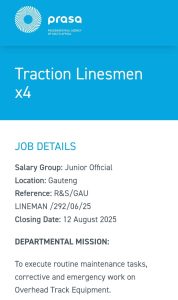 PRASA jobs 2025, traction linesman jobs South Africa, PRASA careers, electrical trade jobs, government jobs South Africa, railway jobs Pretoria, high voltage electrician jobs, technical jobs Gauteng, skilled trade careers South Africa, PRASA job application tips